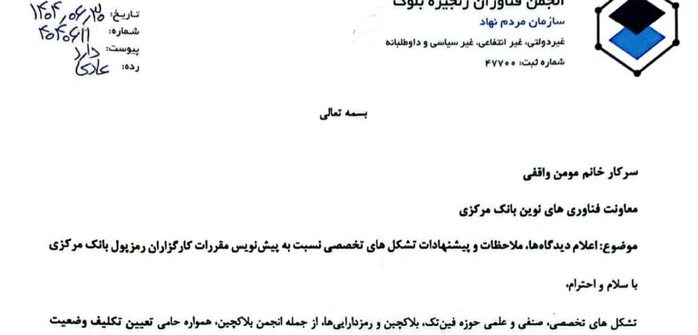 بسمه تعالی سرکار خانم مومن واقفی معاونت فناوری های نوین بانک مرکزی موضوع: اعلام دیدگاهها، ملاحظات و پیشنهادات تشکل های تخصصی نسبت به پیشنویس مقررات کارگزاران رمزپول بانک مرکزی با سلام و احترام، تشکل های تخصصی، صنفی و علمی حوزه فینتک، بلاکچین و رمزداراییها، از جمله انجمن بلاکچین، همواره حامی تعیین تکلیف وضعیت کسبوکارهای حوزه […]